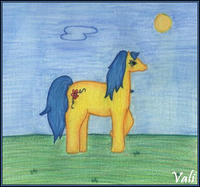 | "Vali" The media used for Vali was pencil, watercolors, and colored pencil Her story: Vali sees an old friend that she wants to say hi to off in the distance! Vali was first drawn up with pencil. Then she was colored with PrismaColor Watercolor pencils then detail was added using PrismaColor pencils. I haven't had much experiance with watercolor pencils but I have plenty with regular watercolors. I just got the watercolor pencils for my birthday so I wanted to start using them for ponies. Using the pencils was alot different so this piece took me some time to do. I love the result of this piece, what I couldn't seem to do with the watercolors I was able to do with the regular colored pencils. With some practice I think I will be able to do some great pieces using this technique. Vali was completed on December 8th, 2003 and was created in 4 hours. I hope you enjoy Vali. Vali is being featured in the gallery section of the MLP Arena! Back to Watercolor Gallery |