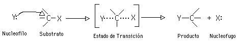La energía necesaria para romper el enlace C-X es suplida por la formación simultánea del enlace C-Y. El estado de transición representa el punto de máxima energía en la curva de energía libre de activación: