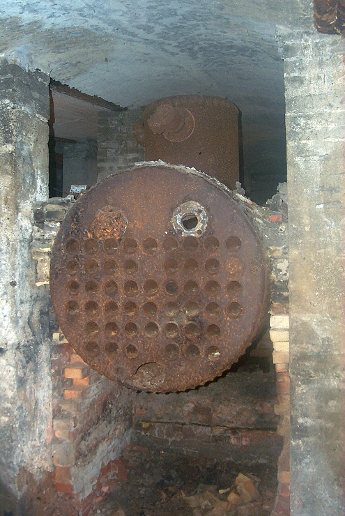 The basement under the theater area can be accessed from the dressing room hall. This area has a ceiling of small linear vaults which are supported by a forest of concrete pillars. Above the vaulted ceiling is the concrete floor of the theater. A commanding feature of this area is this steam boiler. It is a type of boiler which was used on steam ships. It almost certainly saw a previous life powering a Keuka Lake Steamer! Nestled between the concrete pillars, the boiler is 14 feet long and over 3 feet in diameter. Two fire pits are beneath the boiler. The pit at this end is much smaller, probably all that was needed on milder days. A wall similar to one seen in the next photo would have covered this end. |