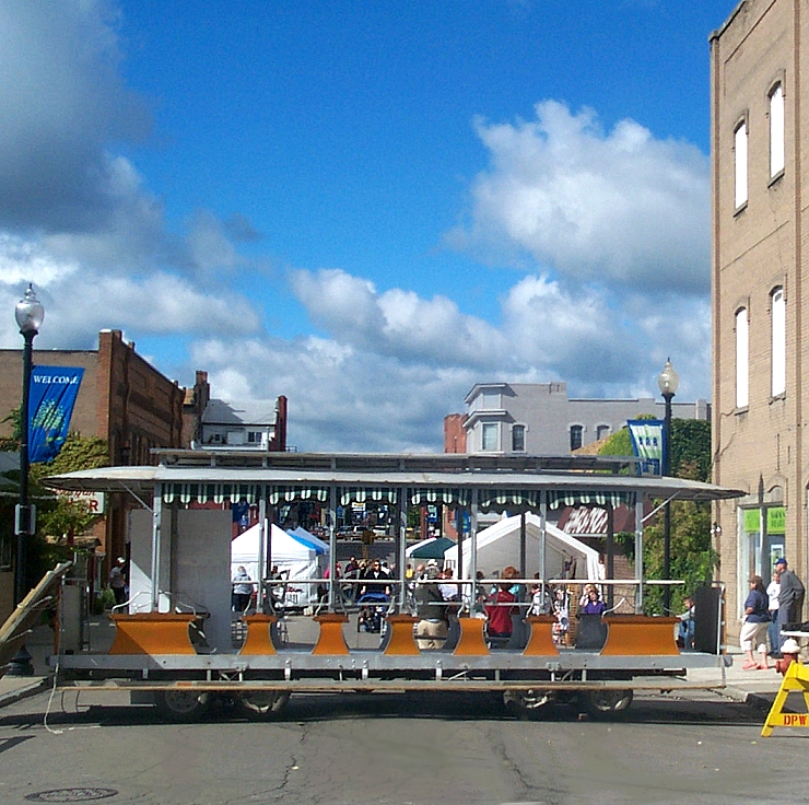 The Trolley sits across the old trolley track bed whose location can still be seen by the cracks in the pavement.