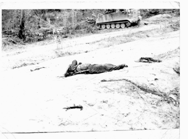 "Don't know who got the kill but it doesn't matter "does it"? If you look close you can see hundreds of fleshetts (DARTS) stuck in him like a porcupine so it had to be a sheridan (Canister Round). I was told they ran over his legs a few times and cut them off, they are laying on the right side of pic. This guy failed the course in the University of North Viet Nam school of war fare . Note he was from the 33rd NVA Reg... SLIM "