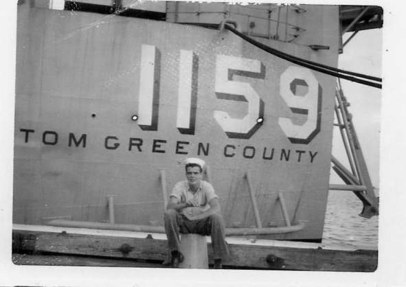 This is a photo of my father with the Tom Green County as a backdrop. The following are my Dad's words: Part of a written recollection of the time he spent aboard the Tom Green.