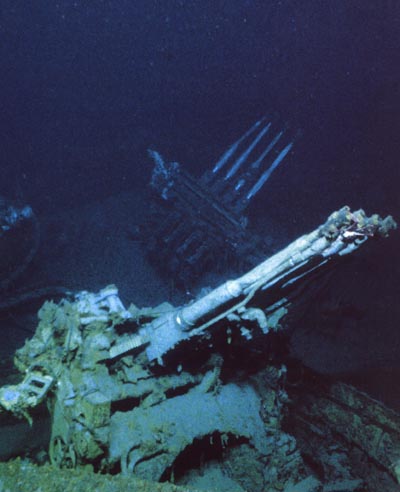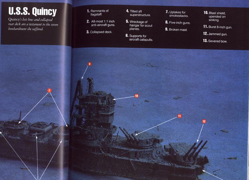 Below are 2 pics of sunken USS Quincy. In the first one, the 3 arrows midships are pointing to the five-inch guns, and the one at the bow is pointing to the severed bow.