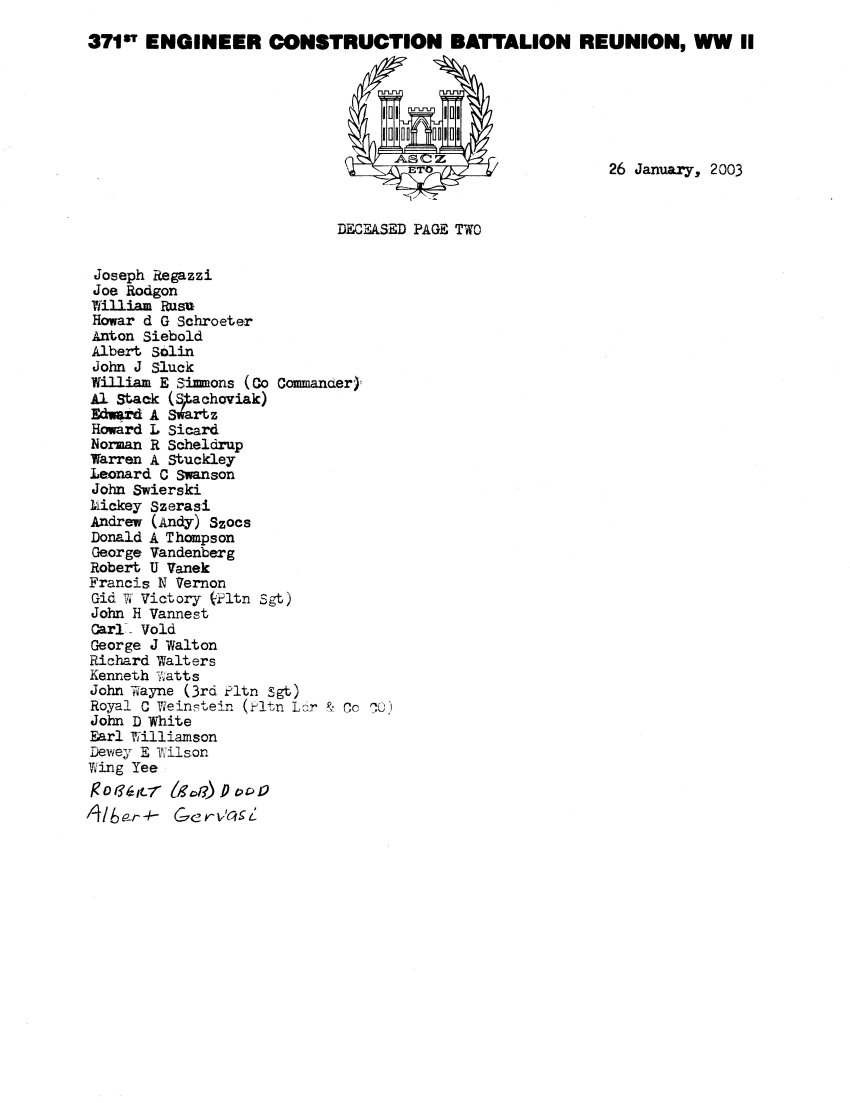 This page lists the known or believed roster of deceased alumni of the 371st ECBn of WWII. It is not totally complete since not all of the unit's records are avaliable.  If you believe we have left someone off these list, please send your proof of information to the Web Master.  If you or a relative or friend is on this list and you can show evidence that he is still with us, we would be overjoyed to correct the error, and to say hello!