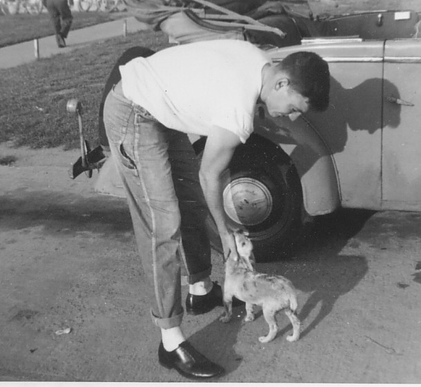 | The only claim that Arab (pronounced a-rab) has to mark him in common with other mongrels is that he actually looks like he belongs to the species Canis of the genus carnivora. Beyond that no futher claim can be made for him. When I first decided to interview Arab I could’t get a word in edge wise, with all that Yip-Yapping and defiant growling. His attitude didn’t impress me one bit and I was preparing to crouch on all fours ready and willing to share his unsociabilities when A/3C George Froeba explained that Arab didn’t have anything personel against me...it was just that he didn’t like officers."You see Sir," Flip Froeba began,"I bought him in Casablanca for 250 Francs (75c) from one of Ali Baba’s Arabians who had perfected the technique of selling him to tourist and then retrieving him with a whistle from around a corner. Only this time I fooled the African huskster and hung on to Arab to make his tenth sale that day the last one". This was all very interesting but hardly explained why Arab relishes sardines and onions with his beer or why he jumps at propellers when the engines are running. Flip had an answer for this one too. "It seems that on cold mornings Arab liks to sit under the warm exhaust of the Putt-Putt, and whenever the engines are started he knows that you (Officers) are going to take it all away from him". Well, it was beginning to make more sense now though I didn’t care to give Arab that much credit. Thinking the interview a failure I turnd to leave and here Arab finally made an impression on me....right on the seat of my pants. Lt. L.J. Del Do |