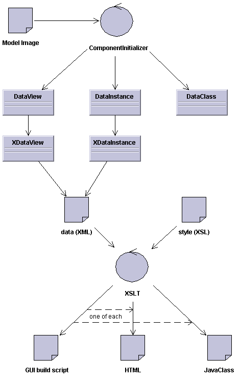 DataView, XDataView: are components holding information about the way certain DataInstance or DataInstanceSet are displayed. This has dependence on the "model life cycle" described later on. The definition of the view is part of the model. The views are instantiated by ComponentInitializer and initialized by the information coming from the model. Therefore, if there is a modification of DataInstances metadata, such as added/changed/removed property, then such a modification is propagated from the model (created by visual modeling tool) into the model image file, which is being read by the ComponentInitializer, which in turn initializes the component with reflection to just performed modification.