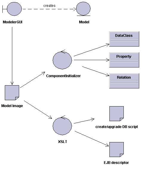 Model's life cycle: is shown in figure 7.1. ModelerGUI is a visual tool used for model creation and modification. The model is stored in model image file which is in turn used in numerous ways. First, it is the input into the ComponentInitializer, described in section 7.1, which creates and initializes components used throughout application's life cycle. Some of the components are the DataClasses, Properties, Relations, etc. This has the already described advantage of propagating model changes into the application without a need of code modification. Next, the image can be used for generation of database creation or upgrade-tion scripts, EJB descriptor files, etc. The obvious advantage of such a life cycle is, that the model information is maintained centrally, by the visual modeling tool and then propagated whenever appropriate.