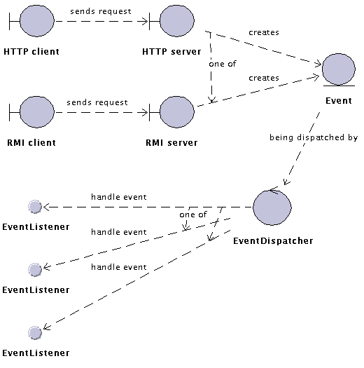 abstraction of the server layer: finally the use of "Event" and "EventDispatcher" is a vehicle for transportation layer abstraction. Since "Event" is all one need to satisfy the request then it is completely irrelevant where or how the event is created. One can switch the transportation layer (from HTTP into RMI, for example) and all the other layers remain without any alterations. This enables either switching the transportation layer or using different ones at once.