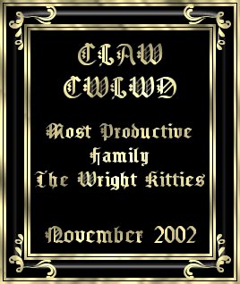 We also adopted two tiny babies in June 2001 from a lady Meowmie works with...a white and cream feline named Chinook and a gray and white named Jesse James. They were born in April 2001 and Chinook was spayed on October 19 2001.