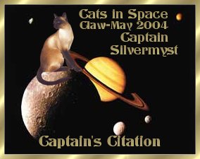 The Mission to Mars was exciting and quite a trial for me as the cats took along the Pekingese for experimental purposes. The Pekes were, of course, not amused. We met an alien spacecraft and they sent a scary green mist all throughout the ship. This caused Shadow to hallucinate and imagine he was as big as a St. Bernard and could take over the ship. We lost gravity and the Pekes were bouncing about but I managed to secure them all. I think I worried off one of my nine lives! Come join us and fly along on our Missions! |