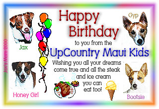 Happy Birthday To You Rambo From The UpCountry Maui Kids Wishing all your dreams and wishes come true and all the steak and ice cream you can eat too!!! Sending Our warmest ALOHA, Jax, Bootsie, Gyp, Honey Girl, and the rest of the UpCountry Maui Kids & Angels |