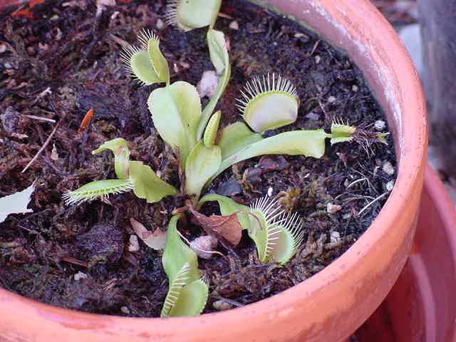 | Venus flytraps have proven to bit a bit of a challenge for me. So far I've had the best success growing vfts in a 6 inch clay pot filled with peat moss with a layer of sphagnum moss on top of the peat. I've had to start over again since the squirrels destroyed my last ones. |