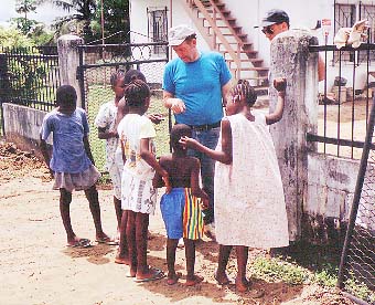 Donald and Wayne talk to a few of the neighborhood children. The second work team handed out candy