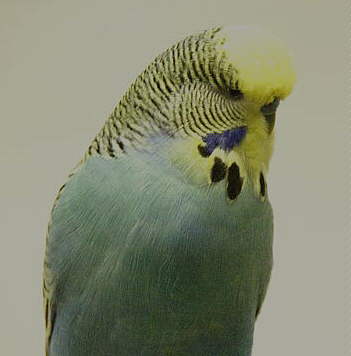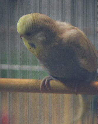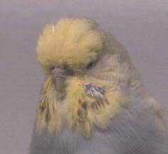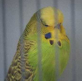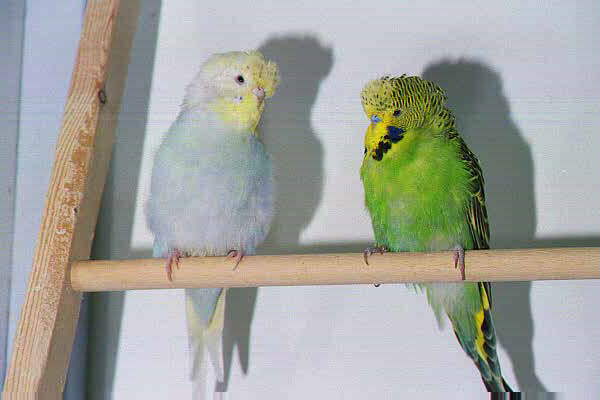 These aren't show birds! These are pals. Summer on the left and Blackbeard on the right are siblings of Spring, but you will notice their heads are flecked. These two have a place in the aviary because they are naturally friendly, often landing on my net or my hand. Blackbeard was in the sale cage for a while, but he is the naturally tamest bird I've ever known. They may produce good offspring, but they won't be mated to other flecked birds. These birds are beginning to look pretty good. At a recent club meeting, several of the Champion breeders commented favorably about Summer.