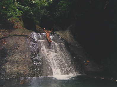 | The falls are beautiful, if not spectacular in the dry season. We are in a gorge surrounded by jungle. There is a beautiful pool at the bottom. We climb up a rock wall at the side and slide down, great fun. Saw my first poison dart frog, bright blue and black. We sunbathe the top of the fall and John tries to slide down another fall above us and finds the rock at the bottom with his butt. Hernan had a fit. When he calms down he tells us that a guides worst nightmare is broken bones. John is O.K. and we take turns sliding down the lower fall. Great. Paradise, yes, but son Bob was nearly bitten by a poisonous snake that was hiding at the top of the fall. One must always be on the alert in the jungle! Back Top Next |