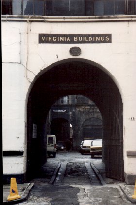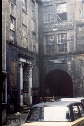 | Below: Virginia Court, a vestige of Glasgow's more prosperous past, in the days of the Tobacco Lords. Were it not for the cars parked in the yard, the picture on the right could have been a scene from a novel by either Charles Dickens or Arthur Conan Doyle.. |