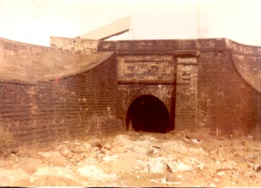 | South-west facing tunnel mouth through which trains passed, leaving and heading towards Buchanan Street Station. In the background can be seen the hazard warning gantry of the M8 motorway. 1970's |