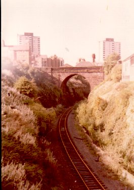 | Monkland & Kirkintilloch Railway track bed at the viaduct of the Edinburgh & Glasgow line, near what used to be Garngaber Junction. 1976 |