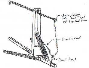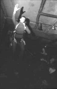 For about a 3 month period in 1997, I wanted to fly over the heads of people while I preached my poetry. Luckily, I was on my summer break from school and had some money to burn. I built this structure durring that time out of oak beams, reienforced plastic tubing, chain, bolts and barn door hinges. It stands 8 ft tall. and can withstand someone who is 300 lbs ( I am 175). It has an adjustable height, so that it can raise a performer to however high the ceilings are (up to only about 10 ft -with my feet only being about 4ft from the ground) I built it to colapse and fold up, but it still is heavy as hell, and barely fits into my car. I wanted to eventually motorize it, or replace the rear lifting chain with a large spring so that I could bounce about fevorishly, but I never got around to it. |