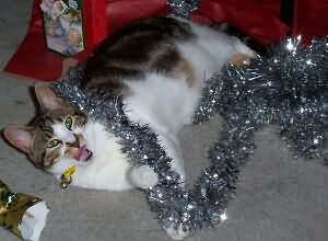 Now he's all grown-up (and outwards a little...) at right he is enjoying a moment of repose in the garden - the backyard is secure, and he is unable to get out. And on the left, he is having himself a very merry Christmas. |
