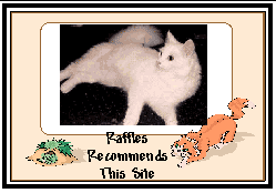 Received November 2000 This is Littleman Raffles...he lives with, Anthony, Cleo, Fudge, Tanya, Rocky, Copper, Sylva, Leo, Bomber, Prince Nazeem, Toby, Bonnie, Dancer, Siouxie, Solomon, Misty, Aslan, Flint, Heidi, Star, Buster, and (phew) Belle the d*g!! They all live at "patandcarol's" place, who have adopted all of these stray or shelter cats. How they have the time to maintain a web-site, and give out awards is beyond me, but I am very happy to have received this one. Go along and met the gang there. |