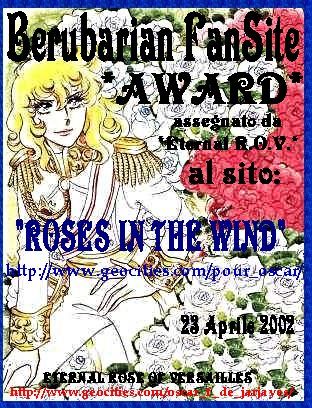 Questo award mi è stato assegnato da Paola, la webmaster del sito Eternal Rose of Verseilles, per aver contribuito alla diffusione sul web della meravigliosa storia di Riyoko Ikeda: GRAZIE!