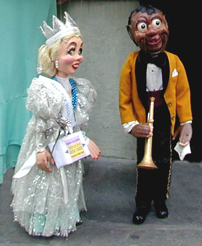 | Meet a troupe of "traditional with a modern twist" puppets and puppeteers. They have travelled to many lands and have performed and sharpened their skills in places that range from the sophisticated to the exotic. From Alaska to Zanzibar they've livened up Festivals, Fairs, Malls, TV, Special Events. Presently based in New Orleans, they are helping to interpret the music by giving it a visual, humorous face. They're ready to travel to your special event. Get set to "Pass a good time!" These extra large, cheerful marionette characters are sure to charm both young and old with their lifelike actions. |