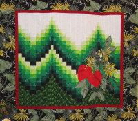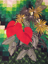 "Anthuriello" combines the bargello pattern with appliques of brilliant red anthurium. It measues 60" x 60". |