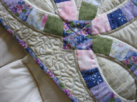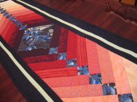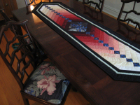 This lovely French Braid table runner was a commission. It is made with 10 fabrics of gradiating colors. The finished length is 72", and the width is 20". |