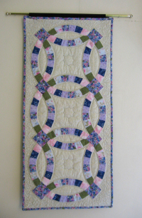 The traditional Double Wedding Ring design is shown here as a wall hanging, but it could be a table runner as well. It displays a variety of blues, greens, and purples, and measures 24" x 54".. |