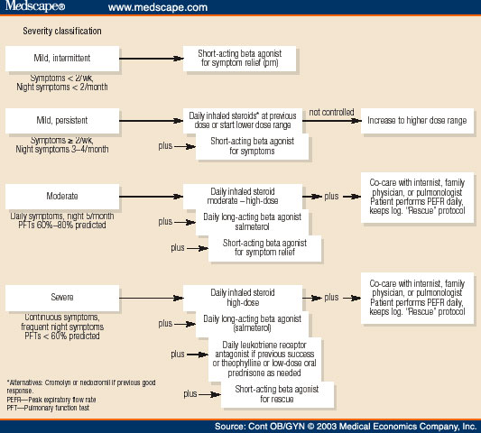 Table 1 summarizes classes of anti-asthmatic medications, including application for chronic or acute treatment of asthma. Table 2 summarizes dosages of commonly used medications, along with FDA Category. Figure 1 provides an algorithm for management of chronic asthma in pregnancy.