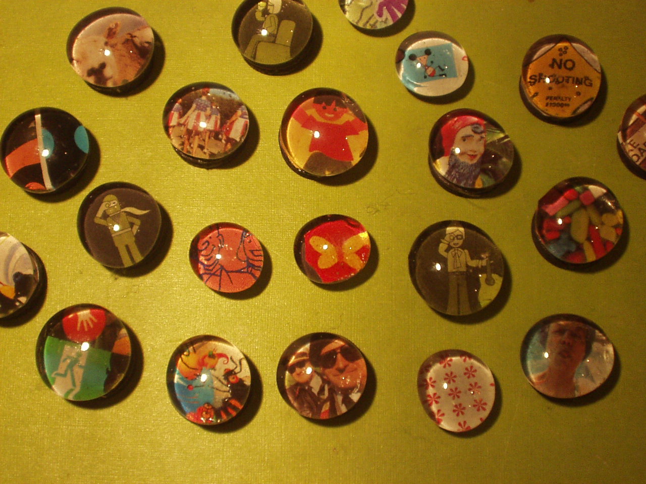 for pictures that would work for marbles, picking up flyers at shows, teraing out adds in magazines and collecting colorful labels. place the marble