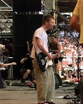 Radiohead's set was inspired, however. They had the crowd singing " This is what you'll get" during "Karma Police"; Yorke bobbed his head back and forth incessantly; and Stipe's guest stint singing lead on "Lucky" added more excitement here than Yorke's turn did for R.E.M.'s set.