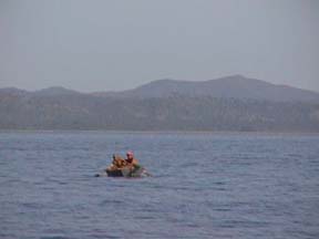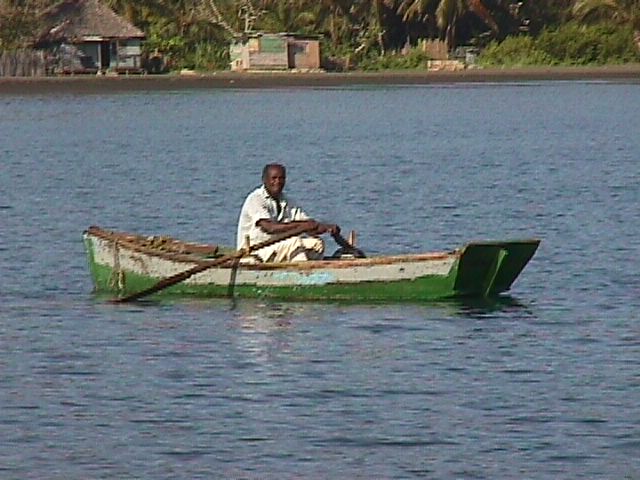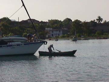There was a middle aged man in a very dilapidated woodenrowboat farther in the harbor waving to us. At first we figured he was just a local fisherman or scavenger who was saying hello to us, but he seemed very insistent on getting our attention. For a bit we weren't sure if he was just waving or trying to tell us where to anchor. Soon it became apparent we wanted us come on into the harbor where he was. Looking at the boat, I wasn't sure he wasn't a local derelict who was just out for a row. He was waving with one hand and dipping water out of the old boat with a can in the other.