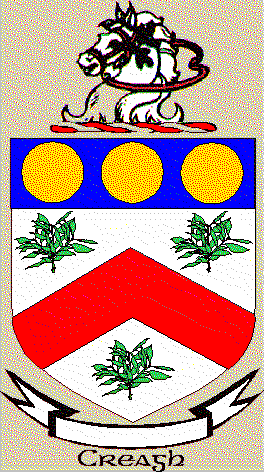 The Irish word craoghach is the adjective formed from the noun craobh, a branch: Craobhach is the Irish form of the surname. This tradition is, of course, the raison d'etre of the laurel branches in the Creagh coat of arms and crest. The Creaghs were reckoned among the leading gentry of Co.Clare. The main branch for generations gave it's sons to the British Army. Those who remained steadfast Catholics were to be found chiefly in Limerick and figure prominently in its records. Several Creaghs were transplanted from Co. Limerick by Cromwell. In addition to the Creaghs of Counties Clare and Limerick, there is a branch of the same name in Co. Cork which was established there before the sixteenth century. All these branches use the same arms. Unlike the majority of old Gaelic surnames that of Creagh is not widley dispersed among all classes of the population.