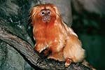 The golden lion tamarin (Leontopithecus rosalia) is a rare and beautiful primate. This small monkey weighs around 11/2 - 2 lbs. and sports a silky, golden coat and a lion-like mane. Its fingers and hands are long and slender and are partially webbed. The tamarin's face is bare of hair. Tamarins live in scattered remnants of the Atlantic coastal rainforest at elevations from 1500 - 3000 feet. They inhabit abandoned nestholes in the middle level of the forest canopy 30 feet above the forest floor. Each tamarin family maintains a territory of around 100 acres, defined by scent marking and inter-group vocalizations. Their natural enemies are snakes and birds of prey. Tamarins eat fruit, insects and eggs and occasionally catch small lizards, toads, and frogs. Tamarins tend to be monogamous and remain with the same mate. This breeding pair forms the base for the small family group of three to six tamarins. The adult male and older offspring help the adult female care for her young. She produces one or sometimes two litters a year, usually consisting of twins. Groups communicate in the dense forest with a wide variety of vocalizations. Several threats combine to make the golden lion tamarin's position in the wild a precarious one. The Atlantic coastal rainforest has been almost completely developed for plantations, cattle grazing and condominiums. Only isolated forest tracts remain. They have also been frequently captured for the sale as pets in nearby Rio de Janeiro. They are highly susceptible to human diseases like rubeola and herpes viruses. Finally, tamarin groups are so small and so scattered that there is the danger they may be inbreeding and losing their genetic diversity. Golden lion tamarins are currently found only in a small area of Brazil northeast of Rio de Janeiro. There are only about 300 golden lion tamarins left in the wild. They are listed as endangered by the U.S. Fish and Wildlife Service and the IUCN Red Book.