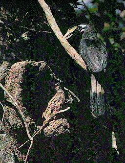 นกเงือกปากดำ (Bushy-crested Hornbill, Anorrhinus galeritus)มีขนาดเล็กกว่า นกเงือกหัวหงอก ลำตัวสีดำปลอด หางมีสีน้ำตาลอ่อนและดำ ตัวผู้มีปากและโหนกดำปลอด ตัวเมียปากมีสีเหลืองอ่อน และดำ หากินเป็นฝูงเล็ก ๆ เมื่อทำรังตัวผู้จะมีผู้ช่วยมาช่วยป้อนอาหารแก่แม่นก และลูกนกในโพรง อาหารได้แก่ ผลไม้ สัตว์เล็ก ๆ และแมลง พบมากทางภาคใต้ เช่น อุทยานแห่งชาติศรีพังงา |