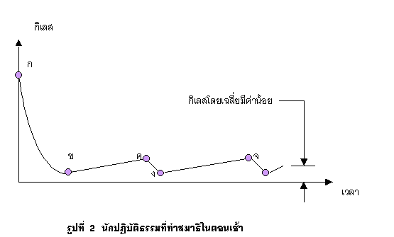 ง-จ เป็นช่วงที่นักปฏิบัติไม่ได้ทำสติสัมปชัญญะ กิเลสก็เพิ่มขึ้นอีกจะเห็นว่าคนแรกมีระดับเฉลี่ยของกิเลสสูงกว่าคนที่ 2 มาก เพราะฉะนั้นการทำให้สมาธิแรงในตอนเช้าจึงมีความสำคัญต่อการปฏิบัติของแต่ละวัน ถ้าเราลองสังเกตดูจะพบว่า วันใดที่เราทำให้สมาธิแรงในตอนเช้า วันนั้นเราจะปฏิบัติธรรมได้ดีเกือบทั้งวัน แต่ถ้าวันใดที่เราไม่ทำสมาธิตอนเช้า วันนั้นเราจะปฏิบัติธรรมไม่ค่อยได้ผล จะโกรธง่าย หงุดหงิดง่าย เผลอง่าย สำหรับผมเองจะใช้ วิธีเพ่งมองภาพแบบปรมัตถ์ โดยการเพ่งมองพุ่มไม้ที่หน้าบ้านทุกเช้าเพื่อให้สมาธิแรง หลังจากนั้นก็พยายามทำสติสัมปชัญญะให้เกิดขึ้นเรื่อย ๆ ในขณะที่อาบน้ำ แต่งตัว เพื่อรักษากำลังของสมาธิไม่ให้อ่อนลง รู้สึกว่าได้ผลดี