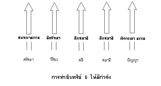 ปัญญา คือ การรู้ตามความเป็นจริงการที่บุคคลบรรลุมรรคผลได้ จะต้องมีอินทรีย์ 5 ที่แก่กล้าหรือมีกำลังมากพอ ถ้าหย่อนในอย่างใดอย่างหนึ่ง ก็จะยังไม่สามารถบรรลุมรรคผล หน้าที่ของผู้ปฏิบัติก็คือตรวจสอบดูว่า องค์ธรรมข้อใดบกพร่องหรืออ่อนกำลัง เมื่อทราบแล้วก็พยายามหาวิธีทำให้องค์ธรรมข้อนั้นมีกำลังมากขึ้น ถ้าองค์ธรรมทั้ง 5 มีกำลังสมบูรณ์ การปฏิบัติธรรมจะก้าวหน้าอย่างรวดเร็ว โดยปรกติองค์ธรรมทั้ง 5 จะเกื้อหนุนซึ่งกันและกัน เช่น ถ้าศรัทธามีกำลังมาก ก็จะเป็นเหตุให้ความเพียรมีกำลังมากขึ้นด้วย ถ้าปัญญามีกำลังมากก็จะทำให้ศรัทธามีกำลังมากขึ้นด้วย ต่อไปจะกล่าวถึงรายละเอียดขององค์ธรรมทั้ง 5 ข้อ ดังนี้