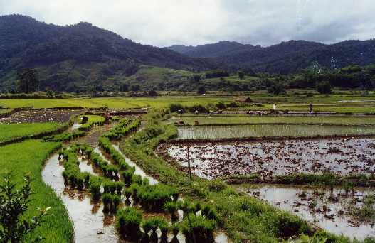 | Our first day in China, we rode by these rice fields. You can see in this picture rice at different stages in the growing process: at first it is planted and it grows closely packed together, as you see in the left hand side of the picture (where the fields look bright green). Then it it uprooted, stalk by stalk, and bunched in bundles such as the ones you see in the center of the picture. People then replant the bundle, but this time, each rice stalk is spaced far apart from the others, as you see in the upper right hand of the picture. The rice is then left to grow up to harvest time. |