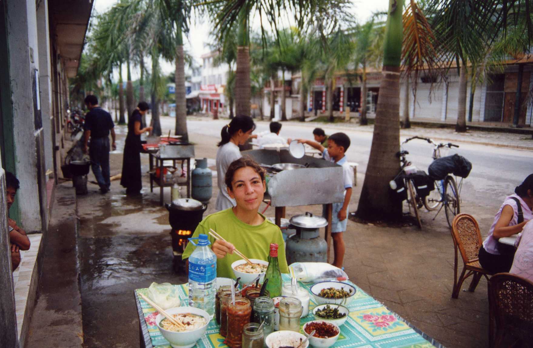 | Raluca having typical chinese breakfast. This consisted of noodle soup with all kinds of spices which you see in the various jars lined up in front of me. It took Ed and I a while to get used to soup for breakfast, but eventually we did. Also very popular and very tasty are dumplings, which are sold everywhere and we used to buy all the time steaming hot. |
