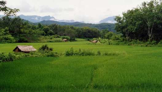 | Houses in the rice fields. At this point we were on a flat portion, riding to Jing Hong. I felt amazing, free and alive just looking at the bright green fields and the misty mountains in the distance. |