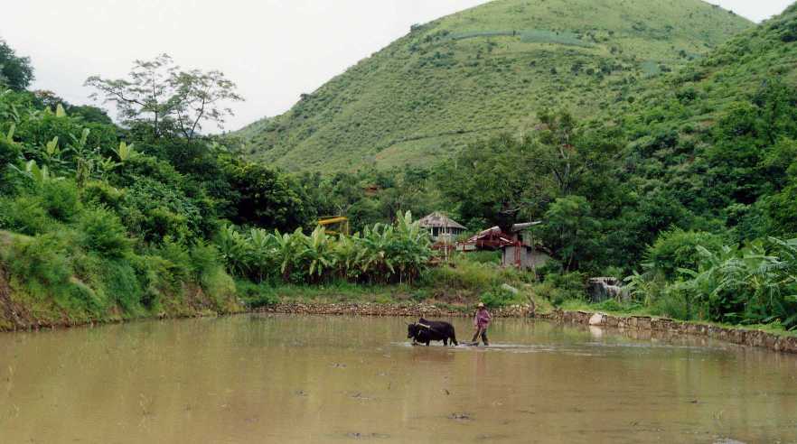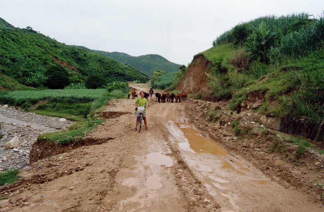 | The nice paved road we had started on in YouanJiang, eventually turned to dirt, as you see here. We passed a few cow herds and some water buffalos as we biked to our elusive destination. |
