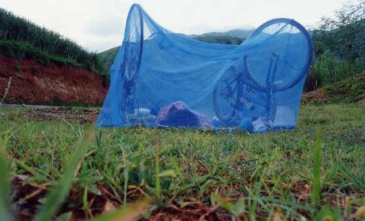 | This shows our sleeping arrangements for the night, in the middle of nowhere. We turned our bikes upside down and draped our mosquito netting on top, hoping that it would not rain that night. We were sleeping on a green tarp we had stolen from an abandoned truck, which stank so bad I thought I would throw up... |
