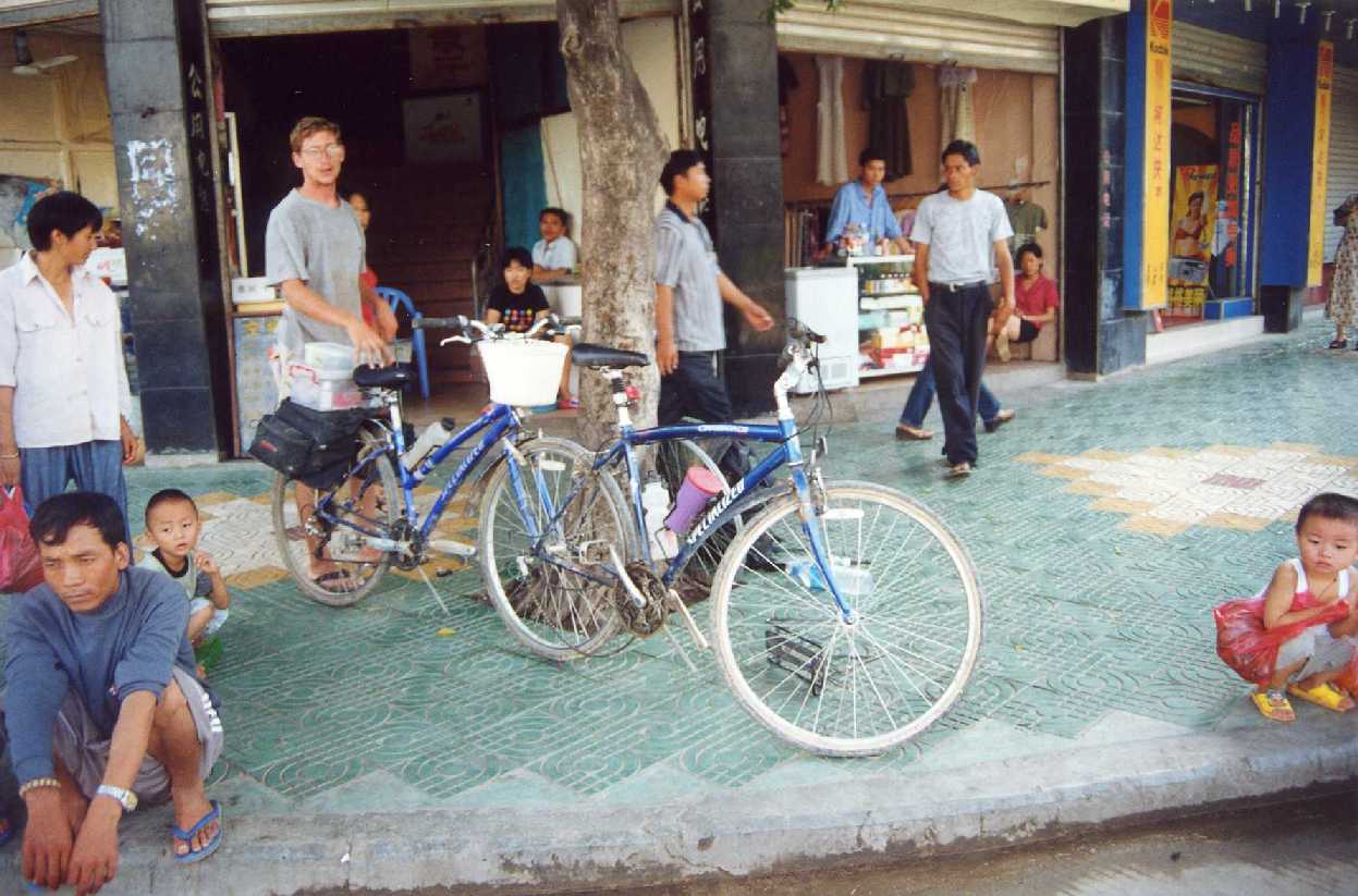 | And here is our attempt to build a tandem bike out of our two individual bikes. It worked mechanically, but the balancing act was something of a challenge which we did not master because we did not need to, as a truck picked us up from where we were stuck and gave us a ride back to the city. |