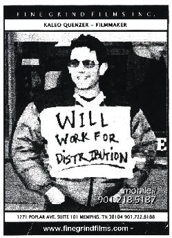 | This is the card we handed out to promote FGF. Guess it worked. After returning home to Tennessee, we received an email from someone who had one of our cards and wanted to see 'The Big Muddy.' Turned out he is the Director of Acquisitions for CinemaNow, an online subsidiary of Lions Gate Films that primarily does distribution of feature films online, on-demand and Pay Per View. Well, we've received a contract from them and are negotiating the terms to sell them worldwide internet rights to our film. We'll put up more info so you can check out their site after we sign on the dotted line. |