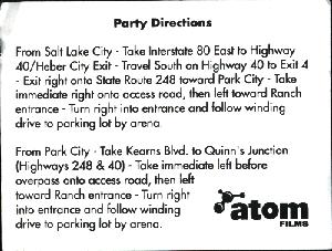 | Another great party was put on by AtomFilms. We got a few passes since they bought our film last year at NoDance. This year their party was held out of town a few miles in a huge empty barn - dirt floor, mechanical bull, a big dance floor and free, unmeasured booze. Atom also had a nice lounge on Main Street - a place to get in from the cold and watch some nice short films. |