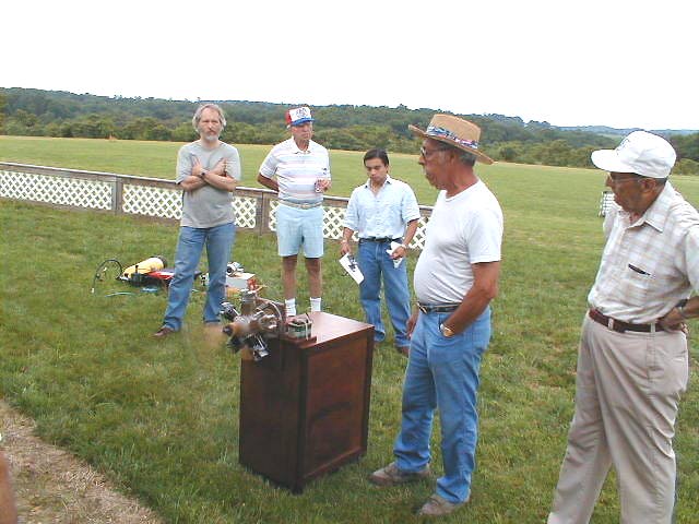 June 27th was engine night at Kirk field. After dedication of our new wind direction indicator built by Joe Radoci, the club witnessed a demonstration of Ed Tenneyson's home built 5 cylinder radial and Ron Stahl's jet turbine. Both were impressive and realistic in their own way. (Use back key to return to main page) |