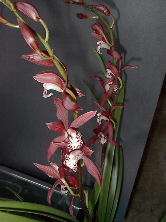These orchids are prized for their sprays of large flowers, used especially as cut flowers or for corsages in the springtime. There are two main types of cymbidiums - standards and miniatures. Where summers are warm (above 90 degrees F), only miniatures are recommended, because they are more heat-tolerant and bloom in warmer weather. LIGHT: Is very important for growing cymbidiums. Coming from cool and bright areas in Asia, they need high light but cool temperatures. In many our climates, the high level of light cymbidiums need is accompanied by high temperatures in the summer, which may cause the plants not to bloom. There are several ways to conteract this: spray the plants with water during summer afternoons to cool the plants down, shade more heavily and increase air movement. The maximum amount of light possible, short of burning, should be given to the plants. This means only light shade during the middle of the day, or about 20 percent shade. In cool areas (e.g. coastal California), full sun is tolerated. Leaves should be a medium to golden green in color, not dark green. Shade more in winter, especially if in bud.