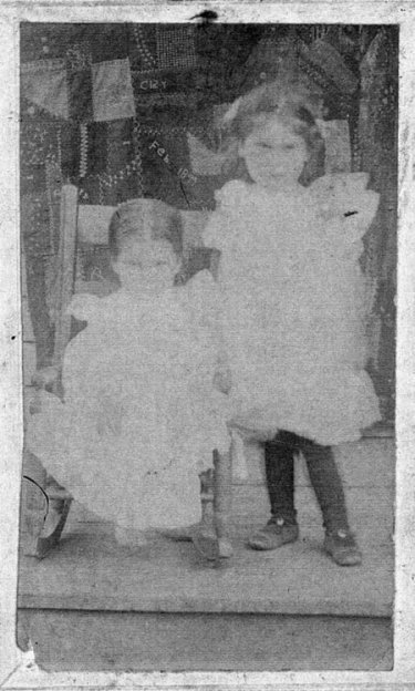 | Mattie & sister Elva Palmer about 1905 Location unknown but was probably on Indian Creek, Menifee Co., Ky. Notice hand quilted bed cover backdrop. Elva and Mattie were close through out their lives. Elva m. Roy Sallee. |
